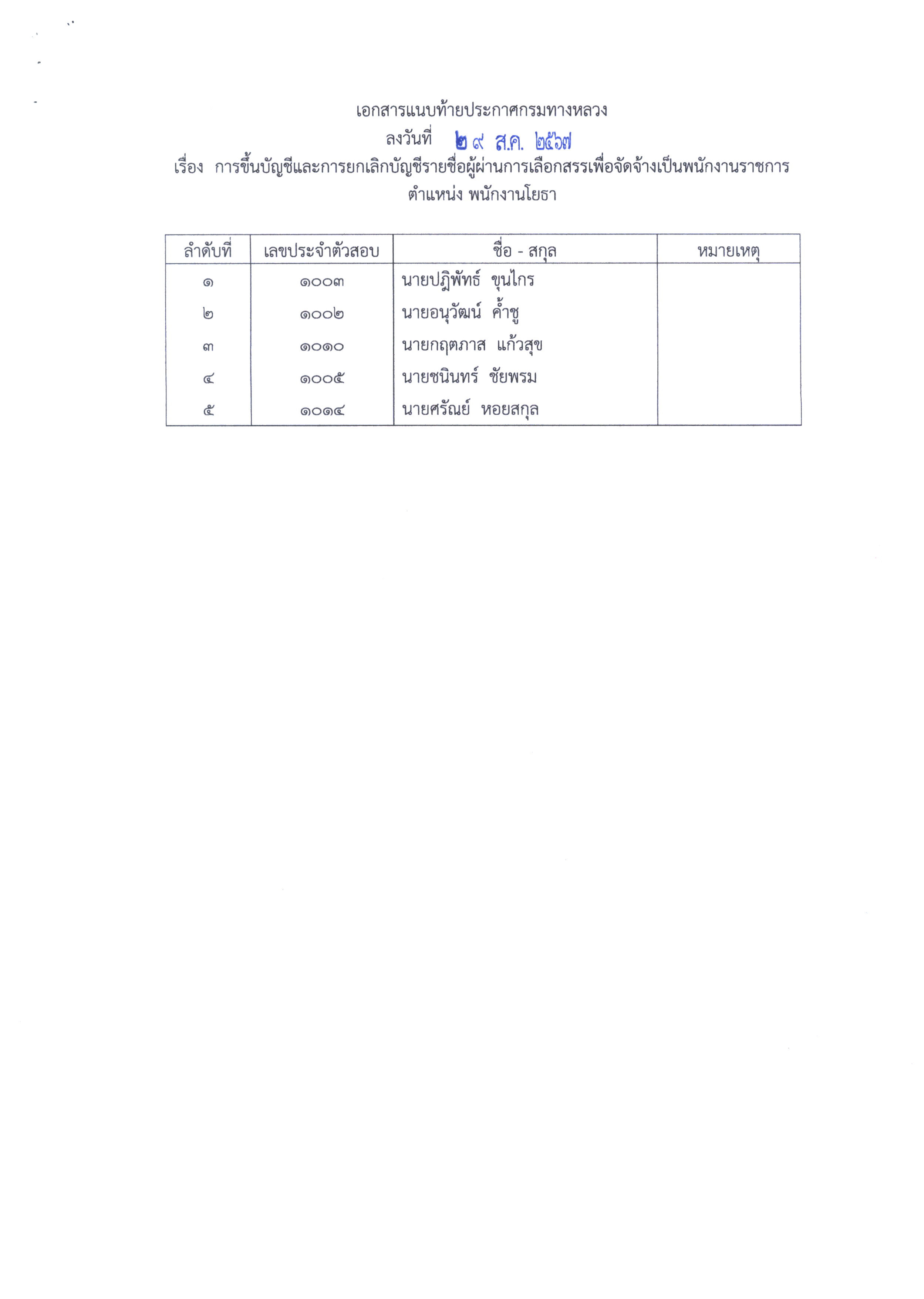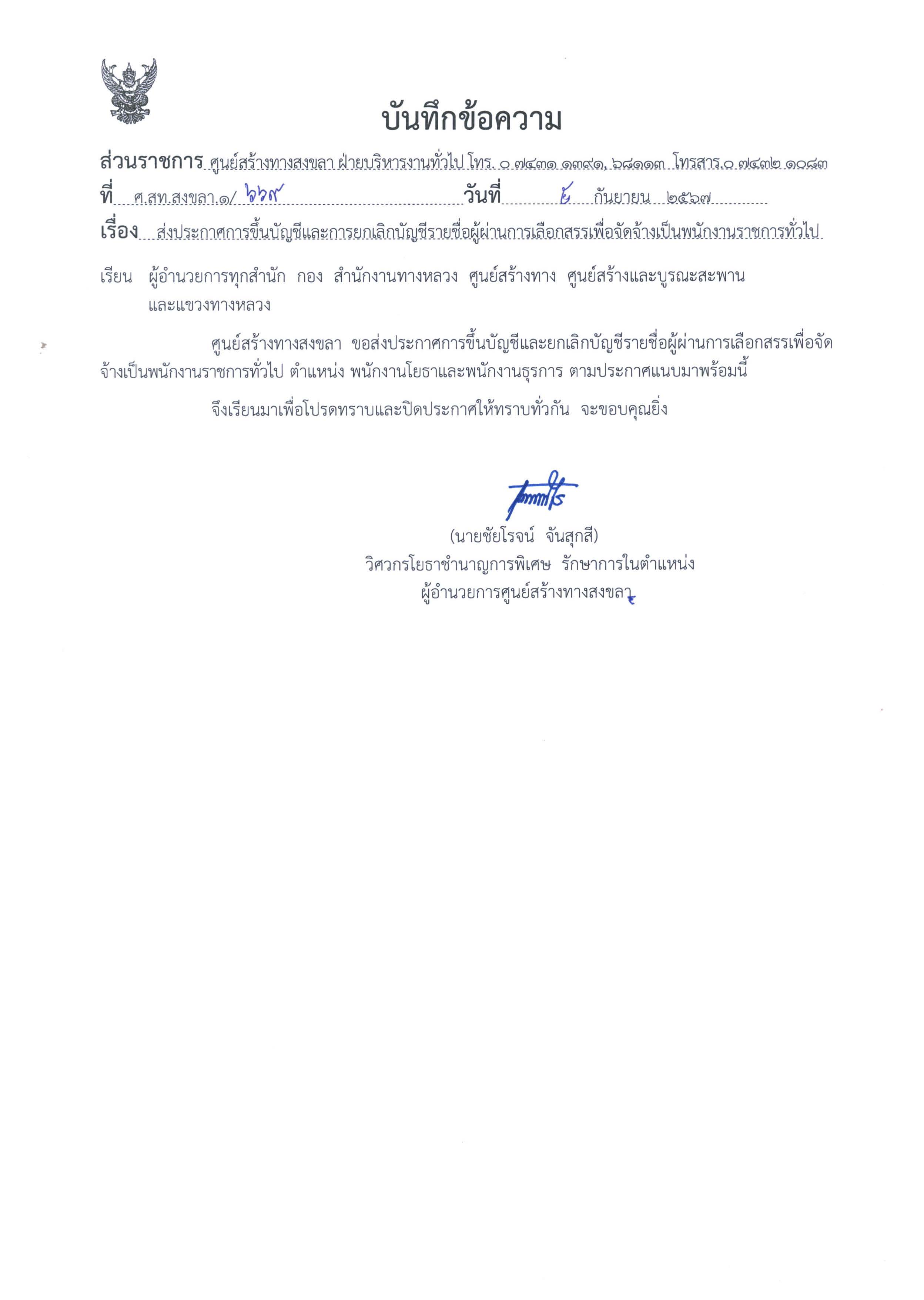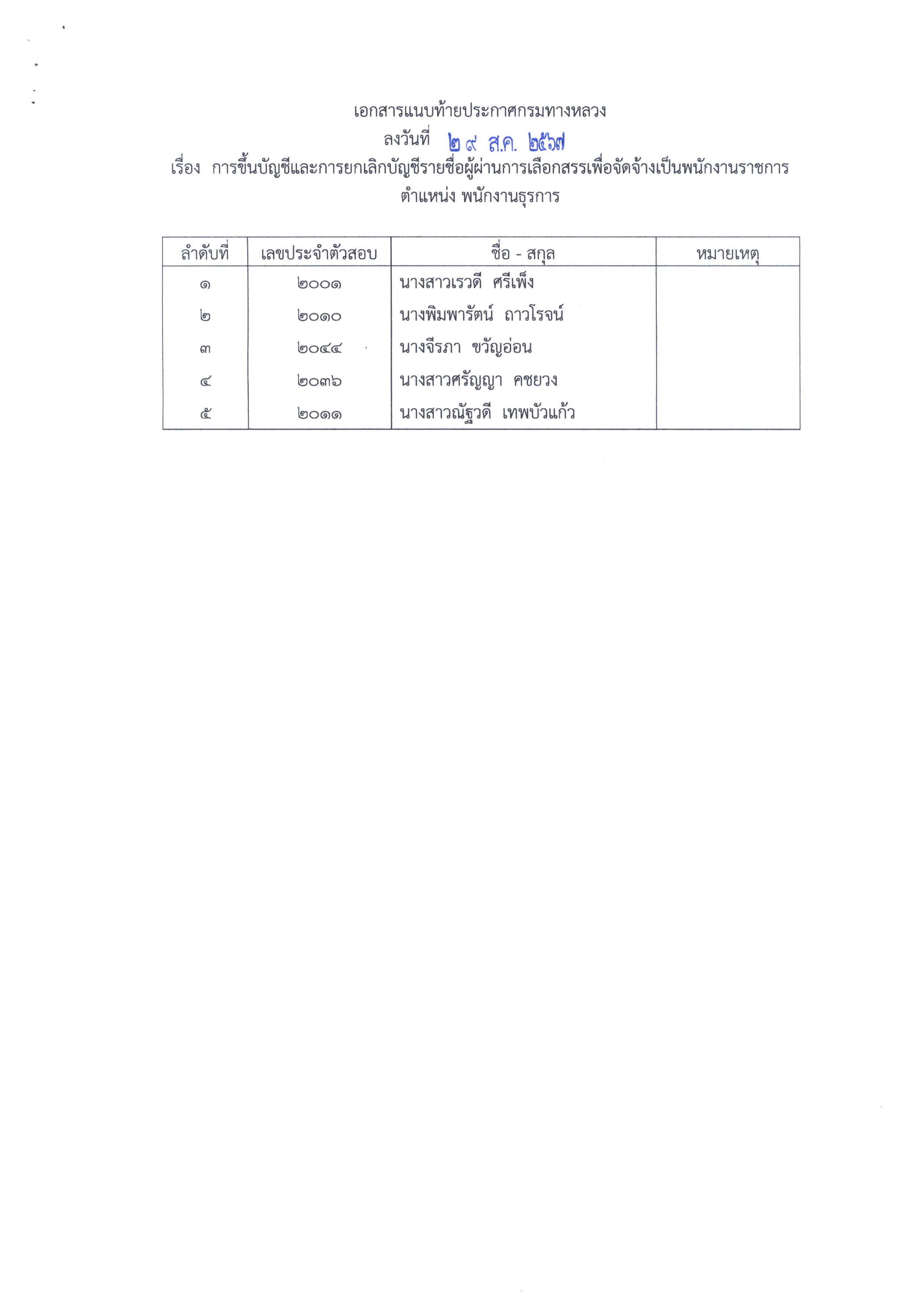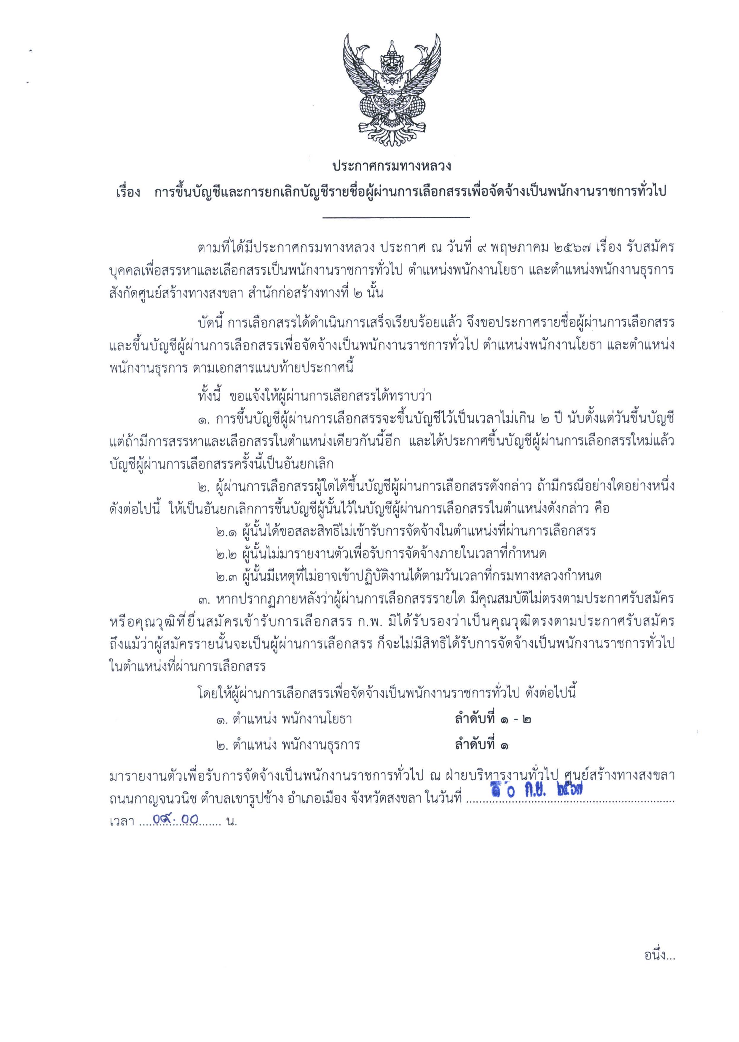 ประกาศการขึ้นบัญชีและการยกเลิกบัญชีรายชื่อผู้ผ่านการเลือกสรรเพื่อจัดจ้างเป็นพนักงานราชการทั่วไป ตำแหน่งพนักงานโยธาและพนักงานธุรการ